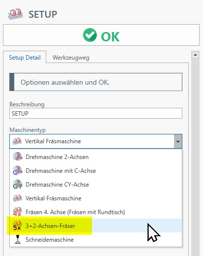 Um diese Funktion zu nutzen, wählen Sie [3+2 Achsen Fräsen] im Setup-Bildschirm.