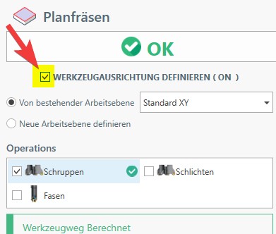 Auf dem Betriebsdialog die Checkbox [Werkzeugausrichtung... ] aktivieren: