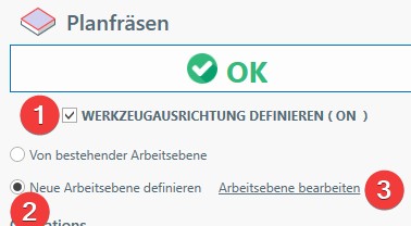 Aktivieren Sie [Werkzeugausrichtung definieren] > Markieren Sie [Neue Arbeitsebene definieren] und klicken Sie auf Arbeitsebene bearbeiten.
