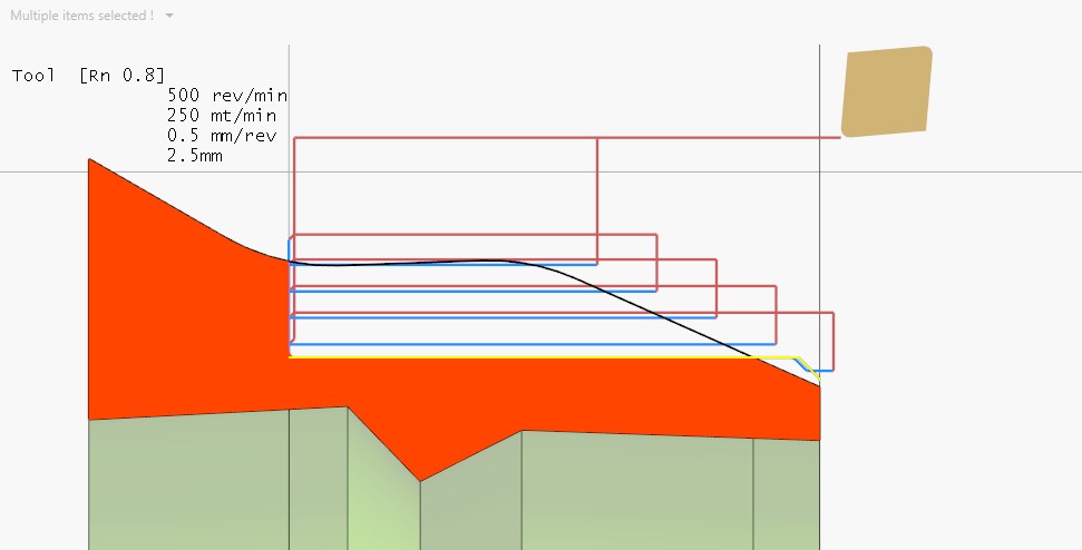 Benutzerdefinierte Roteildefinition am Drehteil Wenn das Rohteil mit der Option "benutzerdefinierte rotierte Geometrie" definiert ist, wird der Werkzeugweg außerhalb des Rohteilbereichs getrimmt.