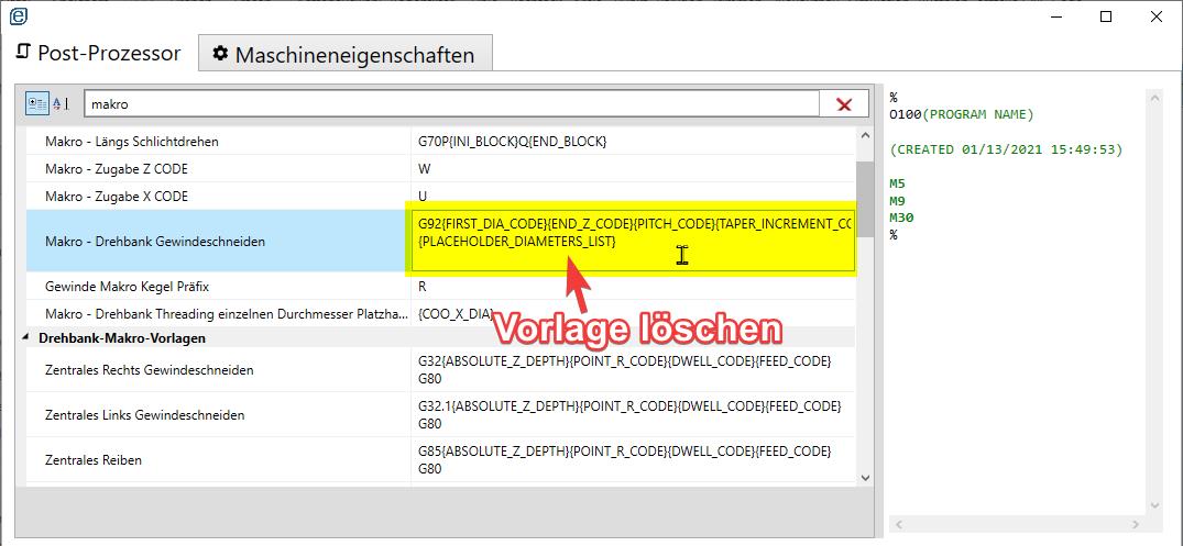 Löschen Sie nun auf diese Weise die Gewindezyklusvorlage aus dem Postprozessor: