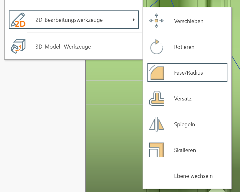 - Die Fasen Option finden Sie in den 2D-Bearbeitungswerkzeugen